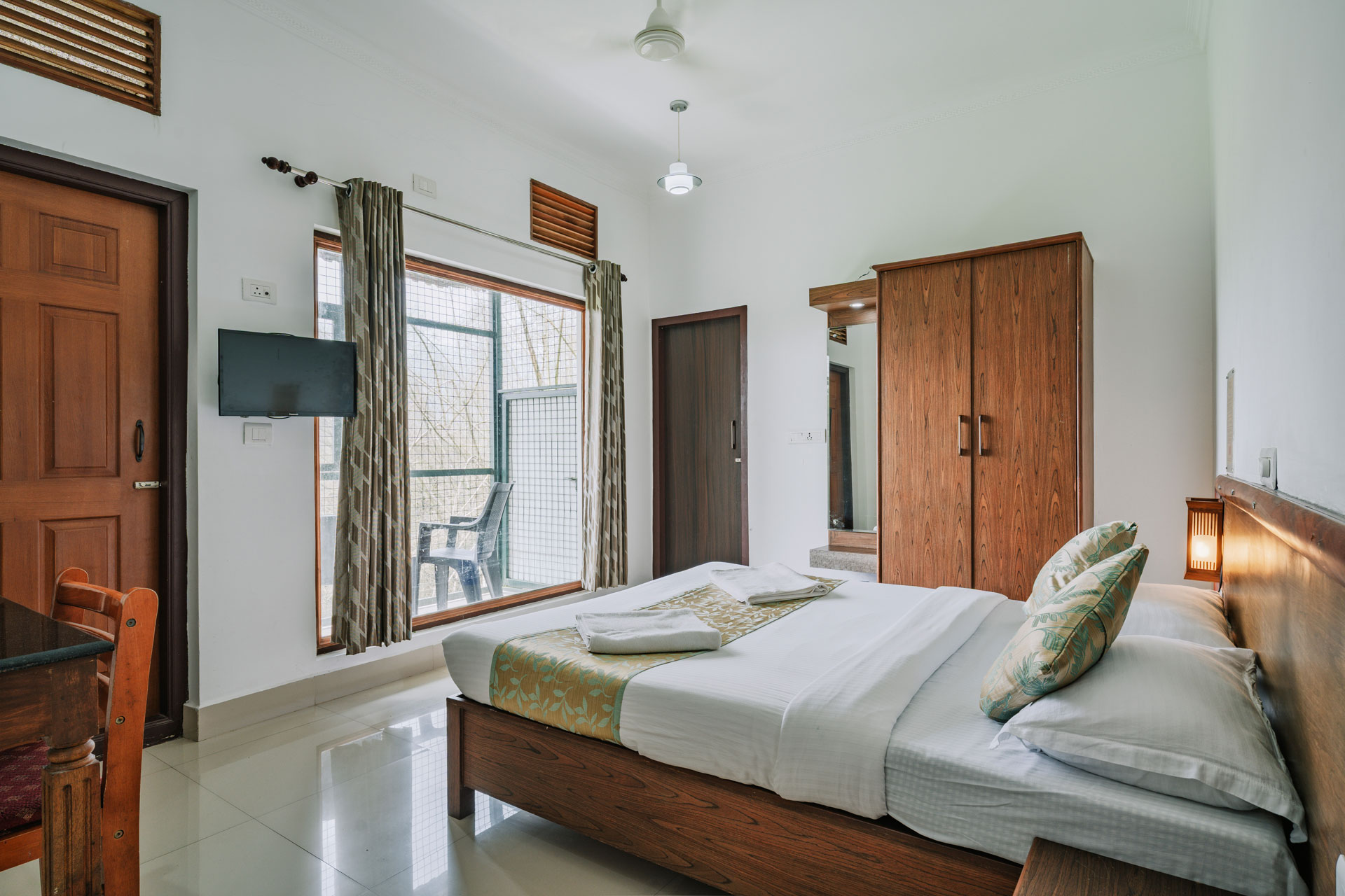 A comfortable room with natural ventilation, ideal for guests who prefer a cool, eco-friendly stay in a peaceful environment.