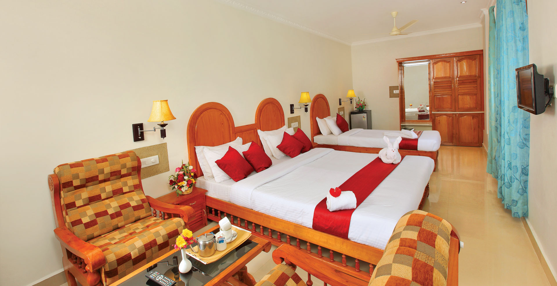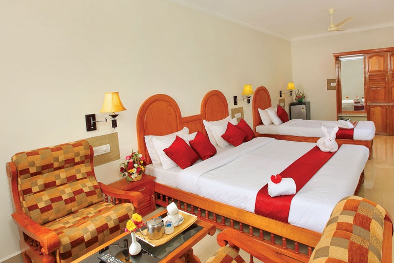 The Triple Sharing Family Room Without Balcony offers a comfortable and practical setup for families or small groups who prefer staying together in a single, well‑planned space. With thoughtfully arranged bedding and a calm interior design, this room ensures a relaxed environment where guests can unwind after exploring the natural beauty of Thekkady. The room is crafted to give you the right blend of simplicity, space, and comfort.